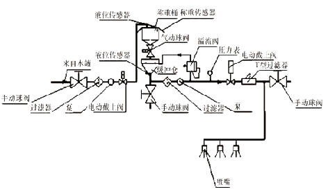 稱重式水添加設備能使粉料的水分增加,解決飼料廠原料水分過低,生產成本過高等問題。該設備是水自動添加系統,是集電-液-氣、機械于一體的機電一體化的設備,主要包括自動化稱重系統、管路堵塞后的泄壓系統、泵動力系統,整個系統主要由泵、球閥、截止閥、溢流閥、傳感器、過濾器、壓力表、管路、稱重桶、緩沖倉、噴嘴等部件組成(如圖2)。該設備的工作過程由微電腦控制系統完成,具有自動化程度高,添加比例準確、控制可靠、霧化完全、操作方便等特點。