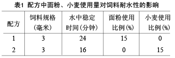 原料的種類及其使用比例對飼料耐水性的影響較大。一些原料可提高飼料耐水性,配方中這些原料的比例較大,則產品的耐水性較好。研究發現一些原料對產品耐水性的影響順序為:面粉>小麥>魚粉>菜籽粕>豆粕>麥皮>玉米>米糠,表1為飼料中分別使用面粉和小麥對飼料耐水性的影響結果。另外原料的新鮮度、蛋白質原料種類也是影響飼料耐水性的重要因素。新鮮的原料黏結性強,制出的飼料耐水性好,同比例動物性蛋白原料制出的飼料耐水性比植物性蛋白原料好。