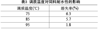 在一定的范圍內,調質時間越長、調質溫度越高,則原料中淀粉的糊化度越高、黏結性越強,飼料的耐水性也越好,一般水產飼料調質時間在40~150秒,調質溫度在80~100℃。調質溫度對飼料耐水性的影響見表3。