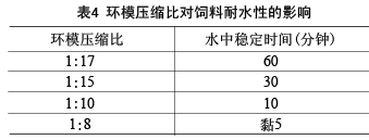 制粒機中環模的壓縮比對飼料的耐水性影響較大,在一定范圍內,環模壓縮比越大,則飼料被壓制得越緊密、飼料耐水性越好;相反,環模壓縮比越小,則制出的飼料也越松散、飼料耐水性越差。一般環模壓縮比在1:(8~17)。環模壓縮比對飼料耐水性的影響見表4。