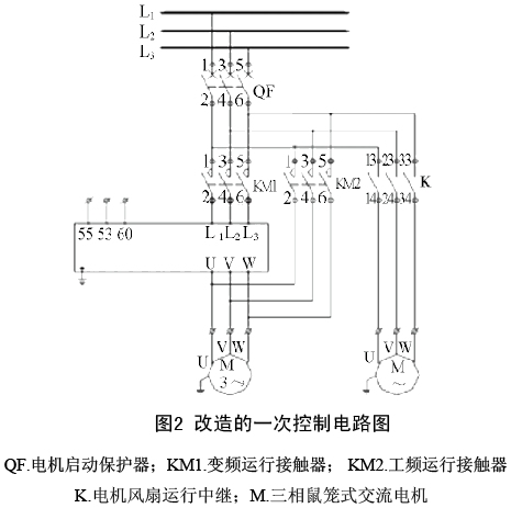 再分析變頻時運行工況:首先把冷卻風機的一次控制電路圖作了改造,見圖2。