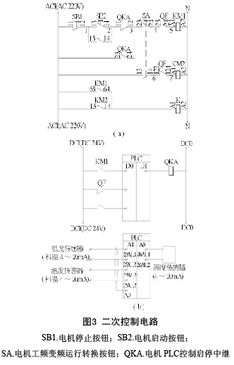 接著重新設計了冷卻風機的二次控制電路,見圖3。最后在冷卻器主體底側和風管上安裝溫度傳感器,根據所測料溫及對料溫的要求,調節變頻調速器,調節冷卻速度,從而降低功耗。