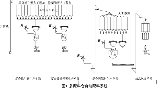 預(yù)混料產(chǎn)品的配方特點(diǎn)是:原料品種多,粒度、密度、靜電特性、顏色、吸潮特性、酸堿度、流散性等物理、化學(xué)特性差異大,相互影響大,因此國(guó)內(nèi)外各個(gè)生產(chǎn)廠家均極其重視配料環(huán)節(jié),在這個(gè)工藝環(huán)節(jié)上國(guó)內(nèi)外企業(yè)做法差異很大。外資企業(yè),特別是歐美為代表的大型飼料生產(chǎn)企業(yè),主張計(jì)算機(jī)控制的多配料倉(cāng)自動(dòng)配料系統(tǒng)。筆者認(rèn)為,這個(gè)系統(tǒng)的優(yōu)點(diǎn)是能夠?qū)崿F(xiàn)自動(dòng)化生產(chǎn),誤操作風(fēng)險(xiǎn)小;缺點(diǎn)是投資大、機(jī)構(gòu)復(fù)雜、故障率高,效率卻未必高,這種工藝不是國(guó)內(nèi)生產(chǎn)企業(yè)的主流。